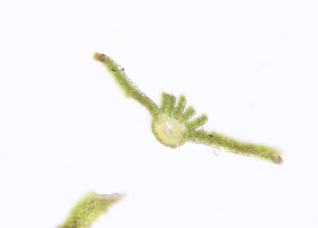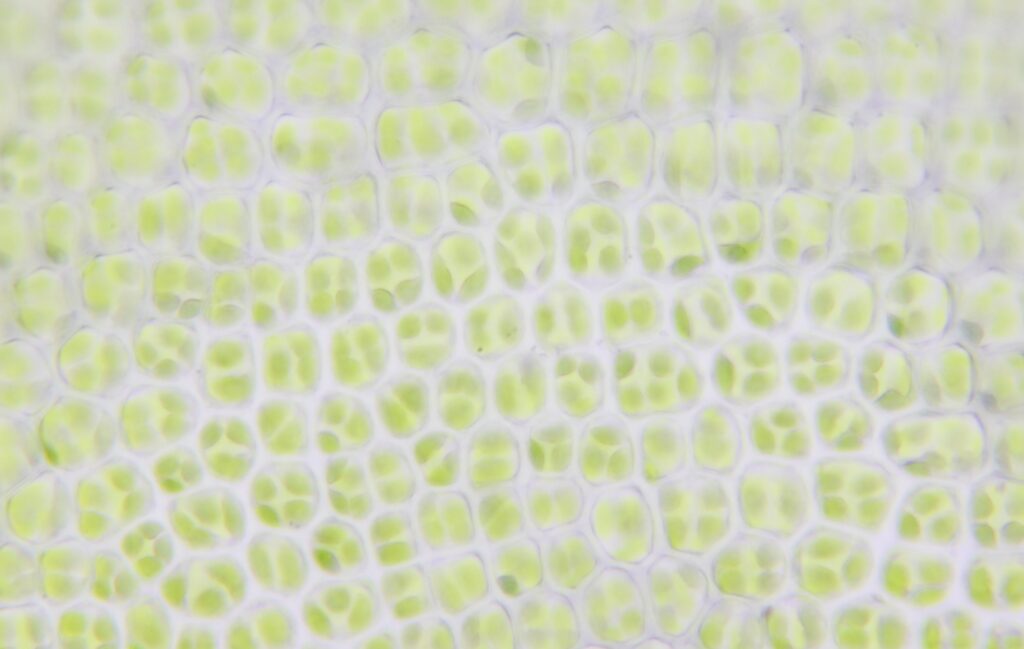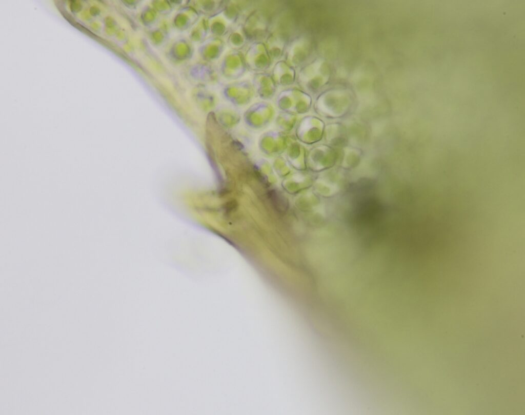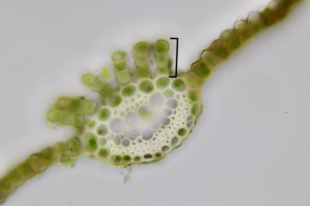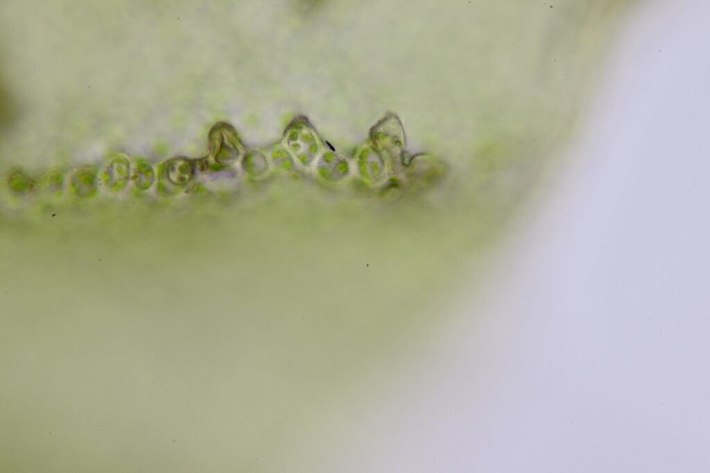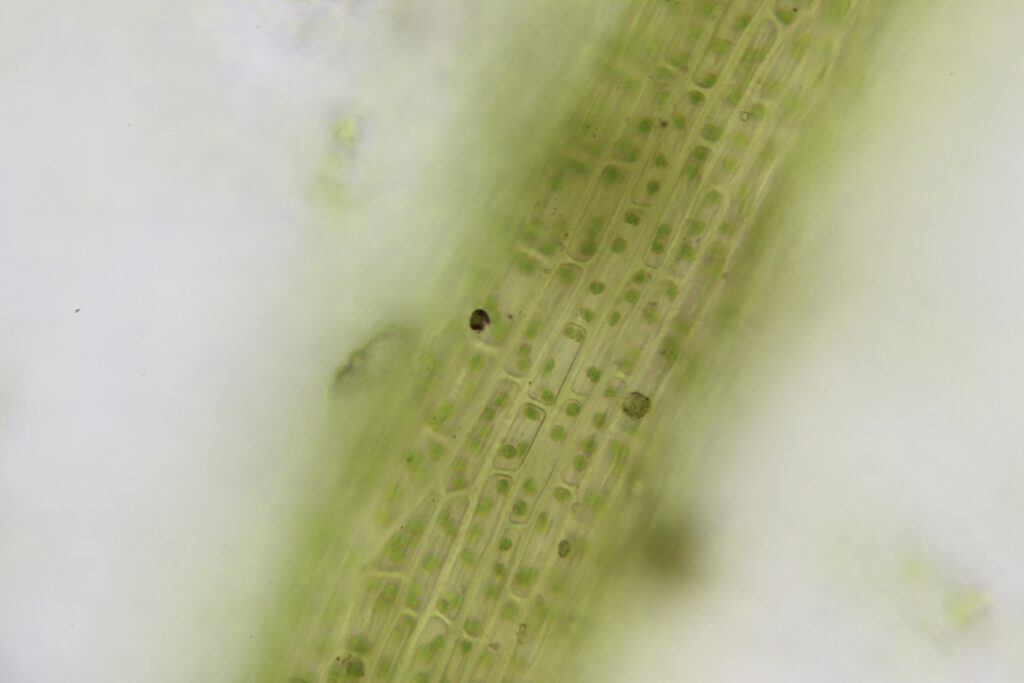 葉細胞呈不規則橢圓形至四邊形,細胞壁清晰。每個細胞依大小不同,含 2–6 個葉綠體。細胞排列緊密。