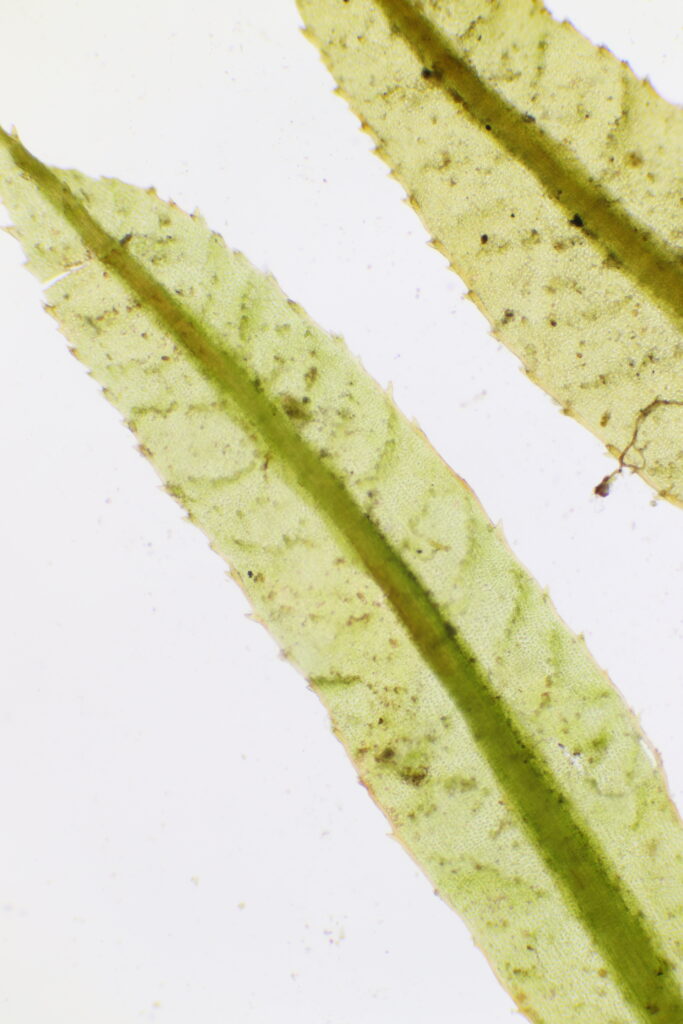 葉片由單層細胞構成,呈披針形,先端尖銳,排列緊密而呈螺旋狀著生於莖上,葉面具明顯橫波紋;葉緣分化顯著,具兩列齒狀構造,葉舷細胞狹長;葉背可見 3–5 個細胞為一排的鋸齒狀凸起,排列整齊如柵欄狀。